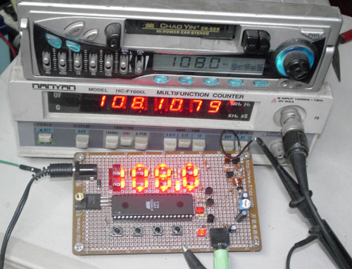 这是站长用分立LED做的四位FM无线发射频率显示的电路,最上面的是数显频率的FM汽车收音机,正在收听无线发射的音乐,中间是数字频率计,显示的应该是无线电波发射的频率,LED无线发射板上显示的频率是108。0MHz,与频率计上显示的有少少相差,站长暂时还不知道是什么原因。(频率计自身有校准功能,应该是没有问题的,由于发射板和收音机距离太近,而收音机显示107.9-108.2时都能接收到音乐。)