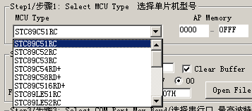 启动本烧录程序后,第一步就是选择烧录器件。本烧录软件支持STC全系列的51单片机芯片,因此,第一步必须选择相对应的型号。由于本实验板选用的单片机芯片就是本烧录软件首次启动默认的型号,所以,本项一般都不需要选择。
