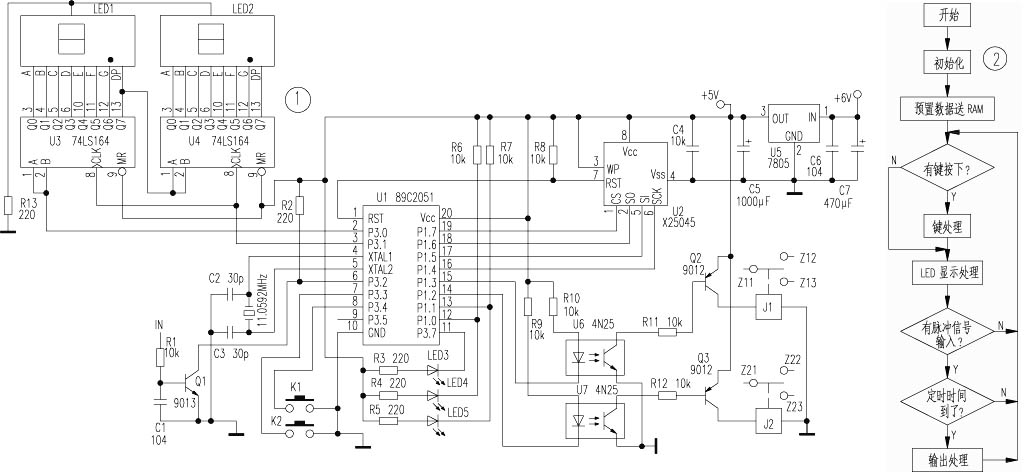 软件流程图见图2。上电复位后,初始化相关串行口和输出口,将上次存入EEPROM中的定时数据取出送LED进行显示;扫描按键是否按下,如有键按下,则进行键处理,然后送显示,同时扫描有无脉冲控制信号输入,如有则进入倒计时显示程序;定时时间达到后,进行输出处理,根据标志信号决定是置零P1.2还是置零P1.3,控制相关的继电器(J1或J2)动作,使电机正转或反转。