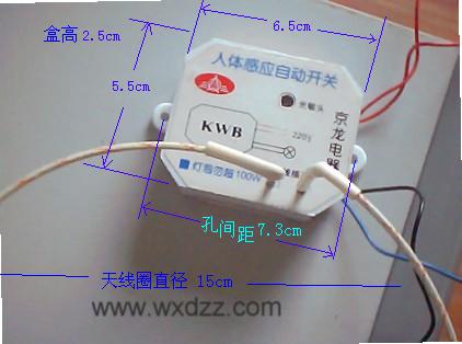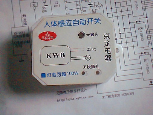 我们的人体感应自动开关有四根输出引线和一只环形微波天线。面板有光敏头,白天光线照射使之呈低阻,锁定内部电路运算放大器无法比较出人本移动的电压变化,灯泡不发光。晚上点亮,延时熄灭。适合在人员流动的地方作临时照明用,如学校和家庭楼道,卫生间,公共厕所,小区路灯。也适合改制成报警器,不被破坏,能透墙感应,能过摆放感应器的位置来调整监控范围,输出端改为接声响报警器或电话拨号电路。特别适合装在人流稀少的物资仓库的防盗,长期外出的家庭防盗,有盗情发生时直接报警通知邻居或以电话形式拨到您的手机上,你还可以进行监听再来确定是否有意外发生。