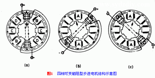 图1是一种四相可变磁阻型的步进电机结构示意图。这种电机定子上有八个凸齿,每一个齿上有一个线圈。线圈绕组的连接方式,是对称齿上的两个线圈进行反相连接,如图中所示。八个齿构成四对,所以称为四相步进电机。