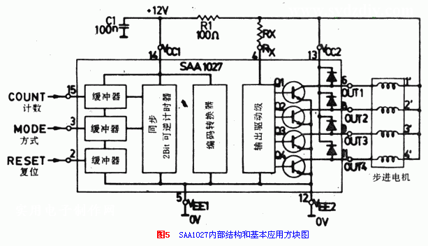 四相步进电机可用几种专用的集成电路驱动器,SAAl027是其中常用的一种,它的特点是工作电压范围宽9.5V~18V;输出驱动电流大,可达500mA。它适合作四相全步步进电机的控制。图4是SAAl027的外形和引脚功能图。图5(下面↓)是它的内部原理方块图及基本应用。