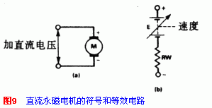 永磁式换向器直流电机,是应用很广泛的一种。只要在它上面加适当电压。电机就转动。图9是这种电机的符号和简化等效电路。