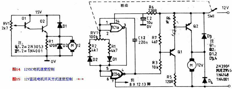 直流电机的转速与所加的电压有效值成正比。图14是12V直流电机的可变电压速度控制。图中Q1和Q2是复合管射极跟随器,电机的直流电压可从0V变到12v。这种电路的特点是:在中速和高速时,速度的控制和自动调节的性能很好。但是低速和慢启动特性比较差。