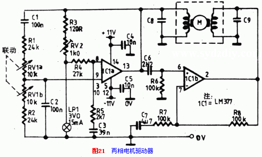 图21为两相电机驱动器电路。这个电路能驱动8欧两相电机。每个绕组可达3瓦。频率在45Hz到65Hz。集成电路选用LM377双路3瓦音频功率放大器作驱动。电源用正负11V。