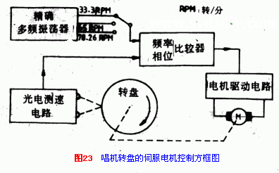 图23是用方块图形式,画出了测速传感器伺服电机系统,能用作唱机转盘精密速度控制的原理图。电机用传统的皮带机构驱动转盘。转盘的边缘,用等间隔反射条文图形结构。用光电测速计进行监视和检测。光电测速计的输出信号正比于转盘的转速。把光电测速计输出信号的相位和频率,与标准振荡器的相位和频率进行比较,用它的误差信号控制电机驱动电路。因此,转盘的转速就精确地保持在额定转速上。额定转速的换档,可由操作开关控制。这些控制电路,已有厂家做成专用的集成电路。