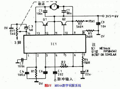 数字伺服电机控制单元,可以买到现成的集成电路。例如ZN409CE或NE544N型伺服电机放大器集成电路。图26和图27示出了这两种集成电路的典型应用。