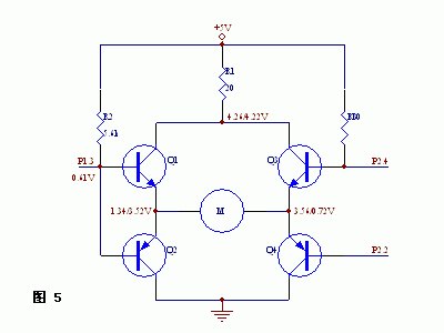 但此电路的Q1和Q3需要分别控制,所需控制引脚较多。如果要用一个IO脚控制则可以加一个反相器。但此电路的Q1和Q3需要分别控制,所需控制引脚较多。如果要用一个IO脚控制则可以加一个反相器。如图3所示。图中标有各点实测电压值。
