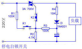 电网供电正常时,它象普通开关一样使用。按一下K1,220V交流电经R1和R2分压给双向可控硅提供一触发电压,使双向可控硅导通。可控硅导通后,在电源电压正半周期间,少量电流经R4、D向C充电,同时经R3、R2分压触发可控硅;在负半周期间,C向R3和R2放电并触发双向可控硅,这样使双向可控硅继续导通,保证负载正常工作。一旦电网突然停电,C上的电荷经R3和R2放电。在电网恢复供电后,由于K1常开,C上又无电压,不能使双向可控硅触发导通,电路呈断开自锁状态,因此没有电流流过负载。只有重按一下K1,负载才能正常工作,从而有效地防止了因断电后恢复供电造成的浪费和事故。常闭按钮K2用于正常供电情况下关断电路。