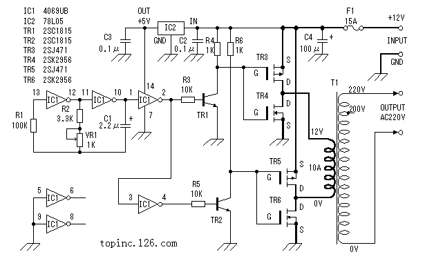 由于方波信号发生器输出的振荡信号电压最大振幅为0~5V,为充分驱动电源开关电路,这里用TR1、TR2将振荡信号电压放大至0~12V。如图4所示。 MOS场效应管电源开关电路。