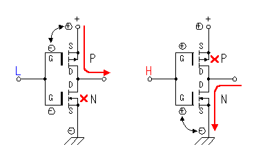 图8 下面简述一下用C-MOS场效应管(增强型MOS 场效应管)组成的应用电路的工作过程(见图9)。电路将一个增强型P沟道MOS场效应管和一个增强型N沟道MOS场效应管组合在一起使用。当输入端为低电平时,P沟道MOS场效应管导通,输出端与电源正极接通。当输入端为高电平时,N沟道MOS场效应管导通,输出端与电源地接通。在该电路中,P沟道MOS场效应管和N沟道MOS场效应管总是在相反的状态下工作,其相位输入端和输出端相反。通过这种工作方式我们可以获得较大的电流输出。同时由于漏电流的影响,使得栅压在还没有到0V,通常在栅极电压小于1到2V时,MOS场效应管既被关断。不同场效应管其关断电压略有不同。也正因为如此,使得该电路不会因为两管同时导通而造成电源短路。