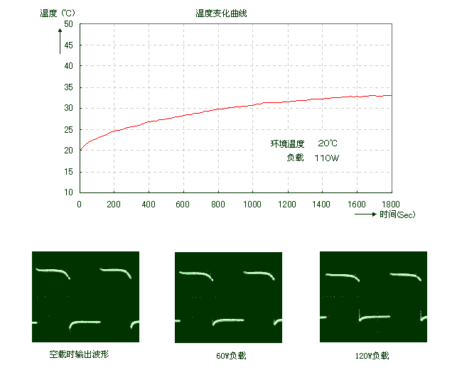 假设灯泡的电阻不随电压变化而改变。因为R灯=V2/W=2102/60=735Ω,所以在电压为208V时,W=V2/R=2082/735=58.9W。由此可折算出电压和功率的关系。通过测试,我们发现当输出功率约为100W时,输入电流为10A。此时输出电压为200V。逆变器电源效率特性见图15b。图16为逆变器连续100W负载时,场效应管的温升曲线图。图17为不同负载时输出波形图,供大家制作是参考。