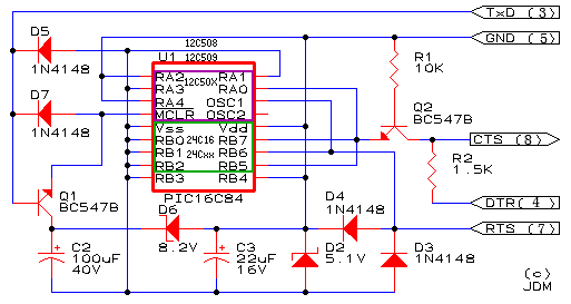 下面我从网上找到的编程器的电路,叫做 JDM Programer ,下面链接是英文原文链接,有兴趣的朋友可以看一下。http://www.jdm.homepage.dk/newpics.htm