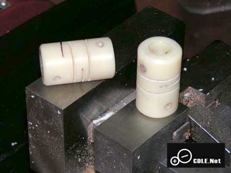 X和Y轴用的两个联轴器两头内孔直径不同,买一个新的要很贵的,二手有没有合适的。所以自己用尼龙做了两个,弹性槽是用锯条拉的,所以不是很整齐,但是使用是没有问题的,扭矩和弹性都能满足要求。