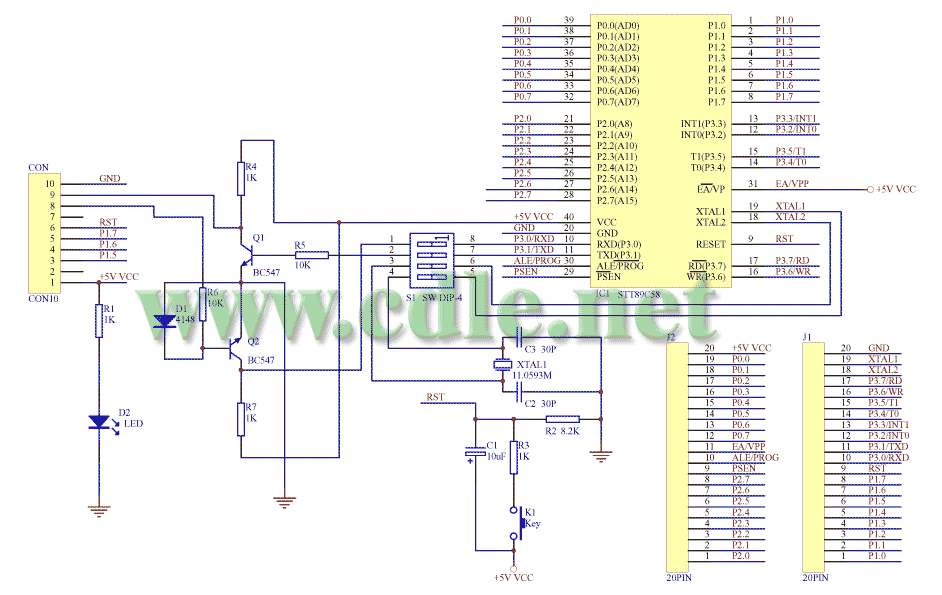 初学51单片机或是业余玩玩单片机开发,每次总要不断的调试程序,如没有仿真器又不喜欢用软件仿真,那只有每次把编译好的程序烧录到芯片上,然后在应用电路或实验板上观察程序运行的结果,对于一些小程序这样的做好也可以很快找到程序上的错误,但是程序大了,变量也会变的很多,而直接烧片就很难看到这些变量的值了,在修改程序时还要不断的烧片实验,确实很麻烦,这时如果有一台仿真器就会变得很好方便了。但一台好的仿真器对于业余爱好者来说确实有一些贵,在这里介绍这种易于自制的51芯片仿真器虽然有一些地方不够完善,但还是非常适于初学51单片机的朋友和经济能力不是很好的业余爱好者。