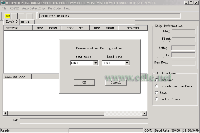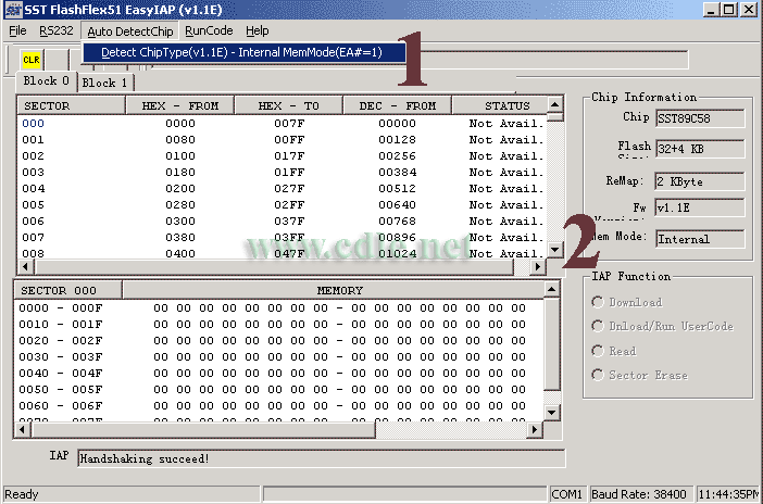 1.首先把CA版的SST89C58芯片插到上面介绍的电路板中,因CA版上已装入了BSL3,你可以先下载EasyIAP11E,测试一下你的电路板是否是正常工作的。(用EasyIAP11F也可以)如果你能保证你的电路是正常工作的可以跳过这一步。把你的电路接到电脑串口上,打开EasyIAP11E软件。