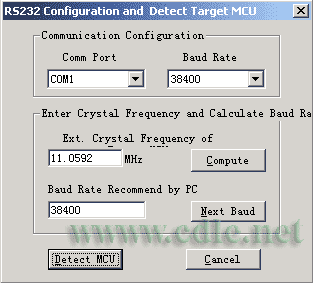 按菜单上的RS232弹出串口设置画面,设好你要用的串口和波特率,选用波特率选用默认的38400就可。确定后按菜单的“Auto DetectChip”图七中1所示。