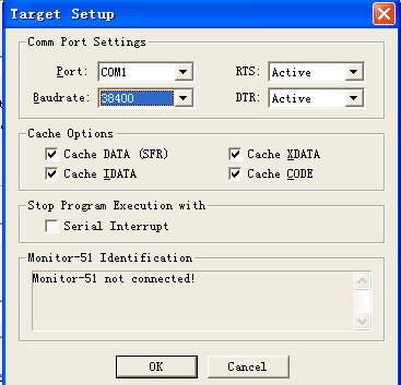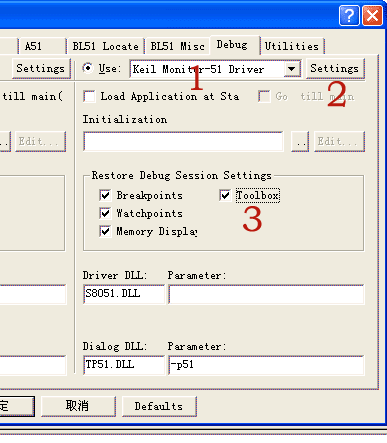 在项目设置Debug页中选择对应本仿真器的KeilMon51驱动,如图23中1所示。图23的3中是选择在仿真时能使用的工具窗口,如内存显示,断点等等。按2进行图24中的仿真器设置。设置好串口号,波特率,晶振为11.0592M时选38400。Cache Options为仿真缓选取后会加快仿真的运行的速度。