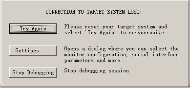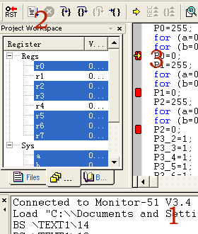 设好后编译运行程序就可以连接仿真器了,连接成功会出现如图25的画面。如连接不成功就出现图26的图,这时可以先复位电路再按"Try Again",还不成功连接的话则应检查软件设置和硬件电路。图25中1是指示仿真器的固件版本为F-MON51V3.4版。点击3中小红点位置时为设置和取消断点,点击2则运行到下一个断点。图27则是变量和存储器的查看。仿真器在软件大概的使用方法和软件仿真相差不多。