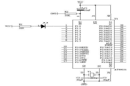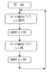如图4.1.1所示:在P1.0端口上接一个发光二极管L1,使L1在不停地一亮一灭,一亮一灭的时间间隔为0.2秒。