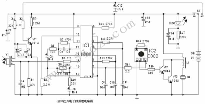当电源开关K1在“OFF”位置时,电源经R2使VT1饱和导通,则IC1的9脚保持为低电平,从而封锁热释电红外传感器来的触发信号Vs,电路不工作。当电源开关K1在“ON”位置时,热释传感器经R1得电处于工作状态,VT1处于截止状态使IC1的9脚保持为高电平,IC1处于工作状态。C1、C13是电源滤波电容,LED1和R17构成电源指示电路。