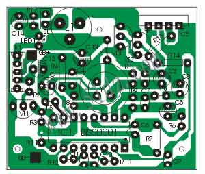 报警音乐片IC2焊接在电路板槽口相应处,先将振荡电阻R15焊接在报警音乐片上,然后将报警音乐片与覆铜焊接处都上锡,然后用少量锡将报警音乐片下方的四个方焊盘分别与电路板覆铜的对应处相连接。