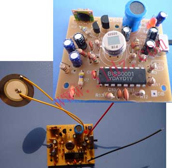 IC1内部的运算放大器OP1将热释电红外传感器Y1的输出信号作第一级放大,然后由电解电容器C5耦合给IC1内部的运算放大器OP2进行第二级放大,再经由电压比较器COP1和COP2构成的双向鉴幅器处理后,检出有效触发信号Vs去启动延迟时间定时器,输出信号Vo经R14驱动报警音乐片IC2工作,VT2和VT3构成复合三极管用来推动压电蜂鸣片发出声音。