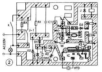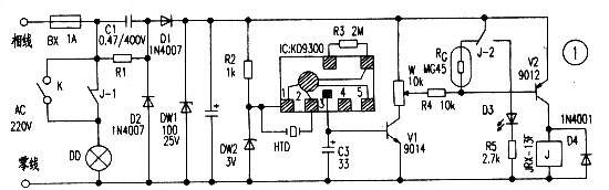 如图书1所示,220V交流电经C1、R1、D1、D2、DW1、C2组成的电容降压12V简单稳压供给控制电路。R2、DW2构成3V稳压电源,供给音乐IC。音乐IC KD9300一般是作门铃用的。每触发一次便自动演奏一首乐曲,其演奏速度由外接振荡电阻R3来决定。作门铃时,R3选用68kΩ,演奏时间在20秒左右。当增大R3阻值时,演奏时间将延。当压电片HTD受到一定强度的声音振动时,能将音频信号转换成电信号,该信号加在音乐IC的触发端,其③脚约+1V左右的直流电压输出,使V1饱和导通。这样12V电压几乎全部加在了可调电阻W两端。W在这里作分压器用,从W的滑动端取出一定的电压送到V2等组成的开关电路,V2导通,继电器J吸合而点亮门灯。RC是光敏电阻。电阻R4、RG组成一分压电路,接在V2的基极与发射极之间,用以控制开关管V2。当白天有光照时,RG阻值很小,V2基一射极间电压极较小,V2始终截止。这样不管是否有人敲门,音乐IC是否有输出,断电器均不会得电,门灯不亮;到了夜晚光敏电阻RG阻值大增,当音乐IC受声控触发而有直流电压输出时,V1导通,经W、R4、RG分压,V2的基一射极间电压超过0.7V时,V2导通,J-1点亮了门灯,另一组转换点J-2断开了RG,点亮了发光管D3。这样一方面可使V2的饱和程度更深,另一方面使开关电路不受灯光照的影响。经数分钟延时,音乐IC复位,其③脚无电压输出,V1、V2截止,门灯熄灭,电路恢复初始状态。图中K是原门灯用拉线开关。