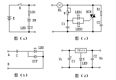 | 选择分类:当前分类——实验基础 相关联或者相类似的文章: 发光二极管的几种特殊用法(1236) 集成电路的检测常识(793) 用万用表判断电容器质量(777) 晶体二极管的主要参数(773) 无线遥控门铃(747) 万用表常见故障及原因(715) 电路中电容的选择(706) 烧坏遥控器给手机充电 专家试解身体静电之谜(692) 几种常用电容器的结构和特点(682) 集成电路的检测方法(679) 晶体二极管的分类(606) 检查大功率双向晶闸管触发能力的方法 (559) 双向晶闸管(TRIAC)(544) 单结晶体管原理(543) 小小电容之大大观(502) 怎样拆卸电路板上的集成电路块(485) 检查晶闸管的触发能力四种方法(425) 省电实用的电话灯(395) 如何鉴别可控硅的三个极(347) 蝙蝠牌电蚊拍故障检修(304) 首页 前页 后页 尾页 本站推荐: | 发光二极管的几种特殊用法 发光二极管是我们经常用到的器件,这里我们介绍几种它的特殊用法,这对于条件有限的业余电子爱好者在电子制作中有时会很有帮助(见附图)。 图(a)是用发光二极管LED监视电池电压的应用电路。电路中稳压管DW的稳压值应选电池额定电压的70%左右。 图(b)是LED用在220V、50Hz市电中,作为电器具工作指示或保险丝熔断指示。 图(c)是将两只LED反向并联,用在移相式可控硅调压电路中代替双向触发二极管。 图(d)是用在固定输出三端稳压电路中用以提升输出电压。并可兼作电源指示。 ![]() 1、 本站不保证以上观点正确,就算是本站原创作品,本站也不保证内容正确。 2、如果您拥有本文版权,并且不想在本站转载,请书面通知本站立即删除并且向您公开道歉! |