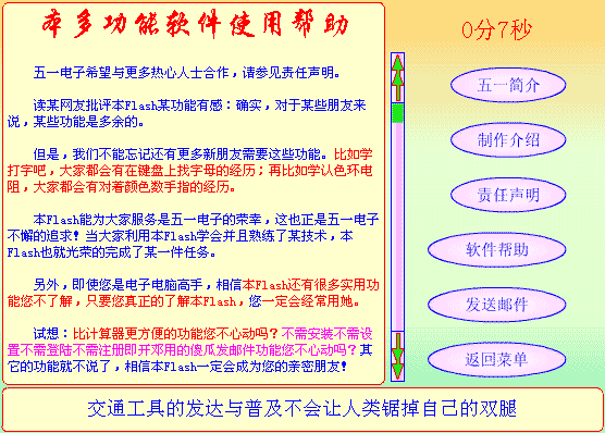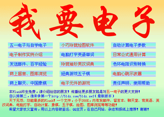 使用帮助,欢迎大家合作!本FLASH功能如此强大,本站是免费提供给大家的,为了能让更多的人受益,本站授权大家可以任意拷贝复制传播,对于专职复职传播本FLASH的朋友,本站还会允许在目标用户愿意的情况下,由复制传播者向本FLASH的目标用户进行适当的收费。为什么本站要允许复制传播者对目标用户收费?因为社会在进化,金钱是纽带,生活需要钱,生存需要钱,在讲话(打电话)都要钱的情况下,难道辛苦为您复制传播者就该为您白白工作吗?当然,如果您很想使用本FLASH但又不想支付费用,您就必须自己来到五一电子网站寻找并下载。