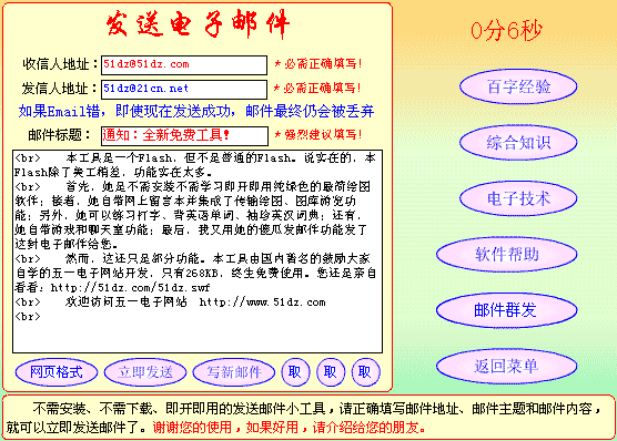 这是发邮件功能!不需设置,不需安装,不损系统,即开即用,输入对方EMIAL和邮件主题、内容,就可以发送电子邮件了。(这需要互联网服务器支持,目前服务器调整,发邮件功能不能用!)