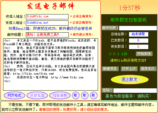 这是邮件群发功能!本功能需要付钱购买,邮件群发时,完全摸拟人工操作,理论上每小时会发送360-36000封电子邮件,设置较低的发送速度时,邮件发送成功率很高,不会被一些反垃圾邮件服务器屏蔽。由于邮件群发时,完全摸拟人工操作,可以在发送时看到被发送的邮件地址会自动变换成下一邮件地址,可以设置发送每封邮件的等待时间为0.1秒到10秒钟,在网速较快时,每小时可以轻松发送7000封以上。(这需要互联网服务器支持,目前服务器调整,发邮件功能不能用!)