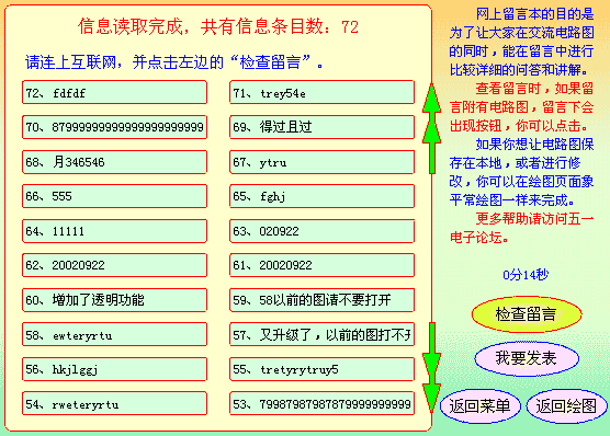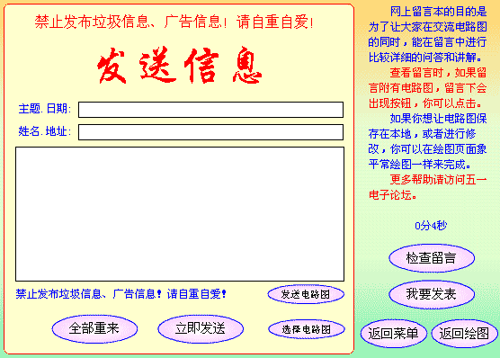 这是发送留言的界面,同时还可以发送电路图给朋友,或者保存在网上让所有人观看。(这需要互联网服务器支持,目前服务器调整,部分功能不能用!)