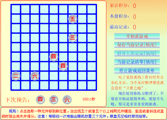 这是一个整理电子元件的小游戏,电子元件分有多种,移动电子元件在不同的格子,当横线、直线、斜线上出现五个(或以上)相同的电子元件时,电子元件存放的五个(或以上)格置就会空出,同时给您加分,如果很不幸的由于电子元件越来越多,占去了所有的格子,游戏就会结束。