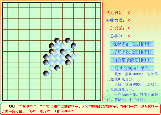 这是一个五子棋的小游戏,具有人机对战功能。五子棋相信大家都非常熟悉,谁先在横线、直线、斜线上出现五个(或以上)相同色子的棋时,谁就胜利了。