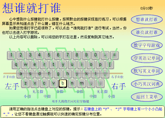 电脑打字功能中的想打谁就打谁。记得我初学电脑时,总是对键盘上“密密码码”的按键感到头痛,在键盘上寻找某个按键还要找半天是常有的事。这个打字功能可以帮助初学电脑的人练习盲打。虽然该类型的软件特别多,但是象本FLASH这么小体积、不需安装、即开即用的还真是少见!