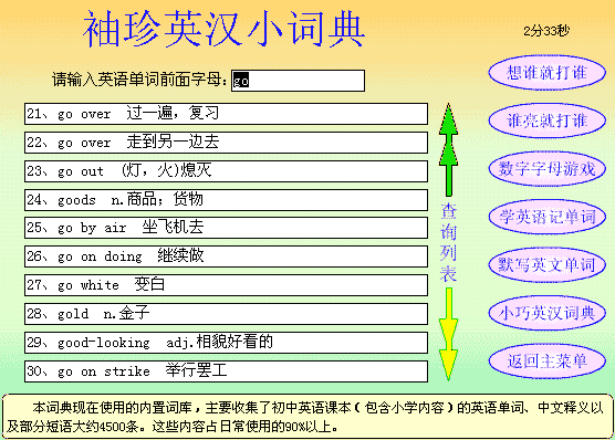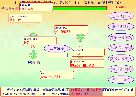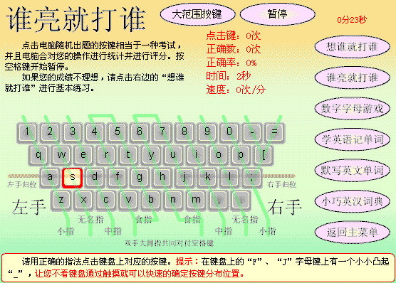 学英语中的打英语功能,学英语有用。记得我初学电脑时,总是对键盘上“密密码码”的按键感到头痛,在键盘上寻找某个按键还要找半天是常有的事。这个打字功能可以帮助初学电脑的人练习盲打。虽然该类型的软件特别多,但是象本FLASH这么小体积、不需安装、即开即用的还真是少见!