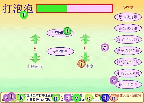 电脑打字功能中的打泡泡功能,学打字很有用。记得我初学电脑时,总是对键盘上“密密码码”的按键感到头痛,在键盘上寻找某个按键还要找半天是常有的事。这个打字功能可以帮助初学电脑的人练习盲打。虽然该类型的软件特别多,但是象本FLASH这么小体积、不需安装、即开即用的还真是少见!