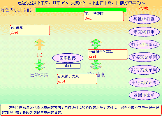 学英语中的默写英语功能,背单词有用。记得我初学电脑时,总是对键盘上“密密码码”的按键感到头痛,在键盘上寻找某个按键还要找半天是常有的事。这个打字功能可以帮助初学电脑的人练习盲打。虽然该类型的软件特别多,但是象本FLASH这么小体积、不需安装、即开即用的还真是少见!