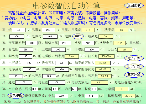电子自动计算电阻电压电流功率功能,非常方便。点击输入框,可以自动根据电压、电流、电阻、功率互相求出求知数值,还可以自动计算无线电波的频率、波长、容抗、阻抗等等电子参数。