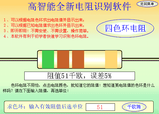 色环电阻正反识别软件!绝对是功能最强,可以轻点鼠标输入颜色自动求出色环电阻值,还可以通过键盘输入阻值自动求出色环颜色环以及色环顺序,四色环电阻和五色环电阻都能准确可靠的运算出正确的结果。这个功能是占在行业领先地位的,欢迎大家试一试。