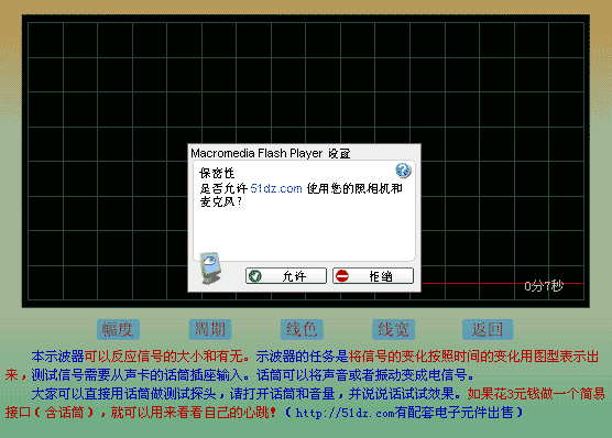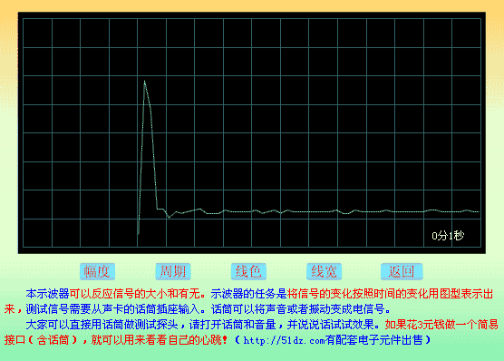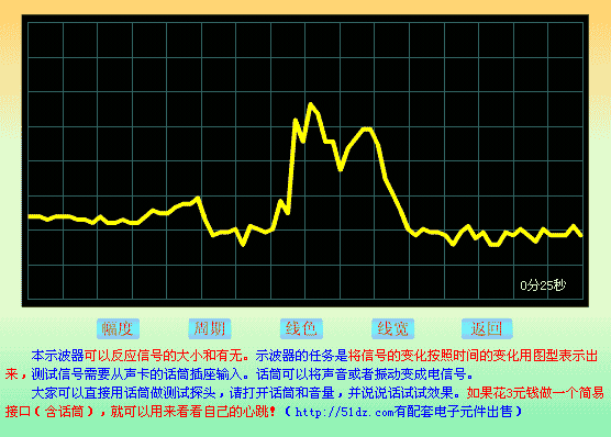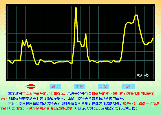 电脑示波器功能。话筒就是检测头。适合有声卡并且有话筒输入或者音频输入的电脑,这个FLAH可以将输入的音频信号的某些特征显示在屏幕上,可以在一定的程度上反应音频信号与时间的对应关系,实现一定的示波器功能。