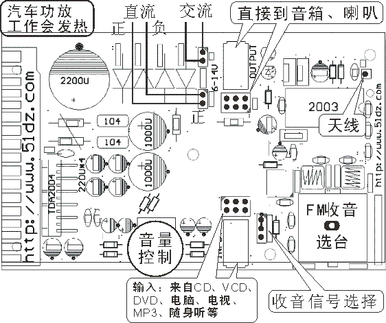 调频收音+20W功放套件,收音部分采用2003集成电路,功放部分采用TDA2004集成电路,配有特制的高效优质散热器。全部采用正规厂家生产的优质元件,本电路板既是高保真功率放大器,又是高品质FM收音机,放音效果完全达到汽车音响效果。装配过程有一定的难度,建议有一定基础的朋友购买。