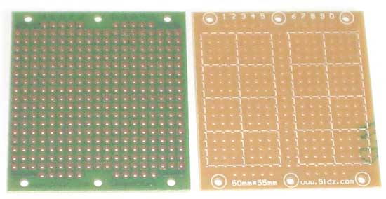 电子制作专用中型万能线路板,本站一大二小三合一的万能板是做模具冲压生产出来的,而本万能板则是电脑机床一个孔一个孔钻出来的,孔径准确美观,由于不是大规模开模生产,所以价格要适当高些。尺寸大小:55mm×50mm,还有六个安装孔,安装孔的间距是20mm和50mm,使用非常方便,适合元件适中的电子制作,特别值得一提的是,本板非常适合安装到本站的电子制作专用盒中!盒子请见/s.asp?id=1815