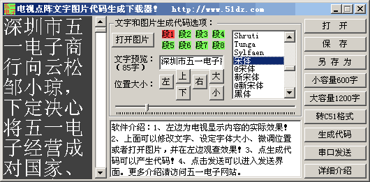 说明:板上有三个控制开关,一个开关控制是否滚动显示,一个开关向前翻页阅读,一个开关控制滚动速度;本软件左边为电视上的将要显示的效界,可以改变字体大小,一般来说,一行最多只能显示8个汉字,否则字体会失真影响阅读,68元的板最多可以储存600字,98元的板最多可以储存1200个字符。