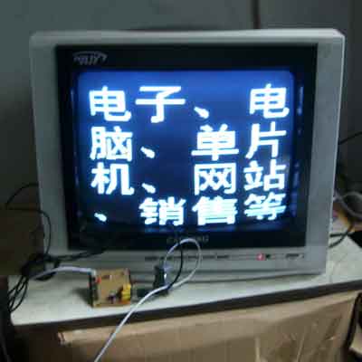 本电路板可以在中国电视机上显示短信留言!文字内容、大小、位置可以利用电脑通过专用配套的下载线修改!本站绝对保证不需要摄影机、不需要摄影师、不需要懂视频编辑软件、不需要刻录光盘、不需要刻录VCD、不需要刻录DVD、不需要VCD和DVD播放机,会打字就可以让您的广告语、祝福语、通知、警告语、产品介绍等等文字内容在短短几分钟内在您的电视机上显示出来!