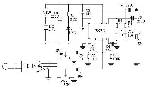 左右声道的音频信号经电位器W调节后,分别进入TDA2822的⑥⑦信号输入脚,放大后分别从③①脚输出,经电容C7、C8推动喇叭发声。TDA2822为双声道立体声电路,但因我们配套的外盒只能装一只喇叭,所以一声道闲置不用,全部元件都已经装好,如要使用只需接好信号输入线,然后外接一引线接到其他喇叭既可以做立体声功放用。