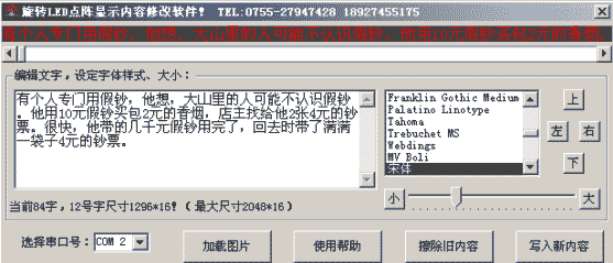 本产品可以让您的广告内容反复显示,广告内容由您自己预先修改,适合店铺柜台销售、产品展示,更适合地摊产品说明、车站寻人带路、K吧交友传递信息等多种用途,目前也有大量情侣用来传递短信、生日祝福等用途。(本站发货时可以免费为用户更改显示内容(120字以内),也可以装好电池(费用另计),让您的朋友第一时间收到后就可以及时阅读!)