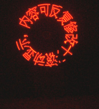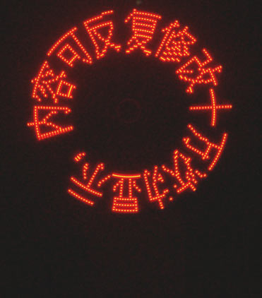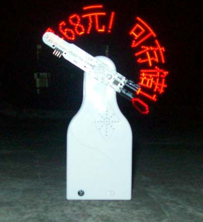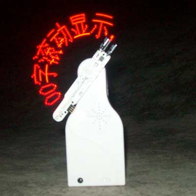 使用方法:装好电池,向右拨动电源开关到位,此时,电动机会开始慢慢转动,必要时可以顺时针拨动一下电路板,帮助电动机启动。电动机转动后,逐渐加速,同时,电路板上LED会在某特定的位置点亮和熄灭,并形成字符显示出来。随着转速的平稳,字符也平稳显示,并按顺序显示。内容显示完后,自动重复重新开始显示。