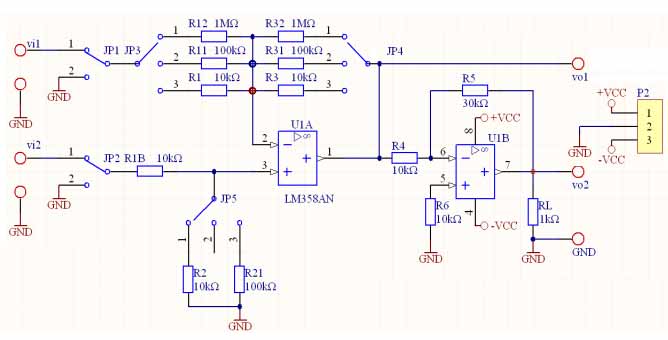 2、同相输入电路的测量 (1)将电路连接成同相输入电路,将4-2原理图中JP1接“2”位置,JP2接“1”位置,JP3接“3”位置,JP4接“2”位置,JP5接“2”位置。按要求将原理图中的短路环连接位置在图4-4中标出。 (2)检查无误后给电路板接通±12V的直流电源。 图4-4 (3)在同相输入端(vi2)加入直流电压VI,依次将VI调到–0.8V、–0.4V、+0.4V、+0.8V,用万用表测量出每次对应的输出电压Vo1。 (4)将同相输入电路的测量数据记录在表4-2中,并与输出电压的理论估算值Vo =[ 1+(Rf ⁄ R1)]VI进行对比。公式中的Rf = ,R1= 。 3、减法运算电路的测量 (1)将电路连接成减法运算电路,将4-2原理图中JP1接“1”位置,JP2接“1”位置,JP3接“3”位置,JP4接“3”位置,JP5接“1”位置。电路要满足R1=R2,R3=R4。按要求将原理图中的短路环连接位置在图4-5中标出。